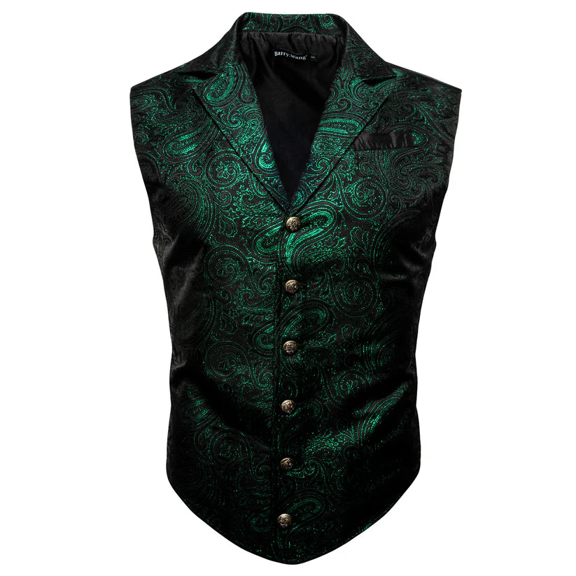 New Green Paisley Silk Men's Single Vest Tailored Collar Waistcoat