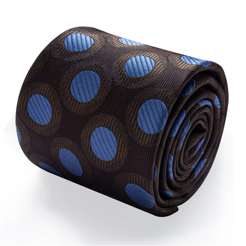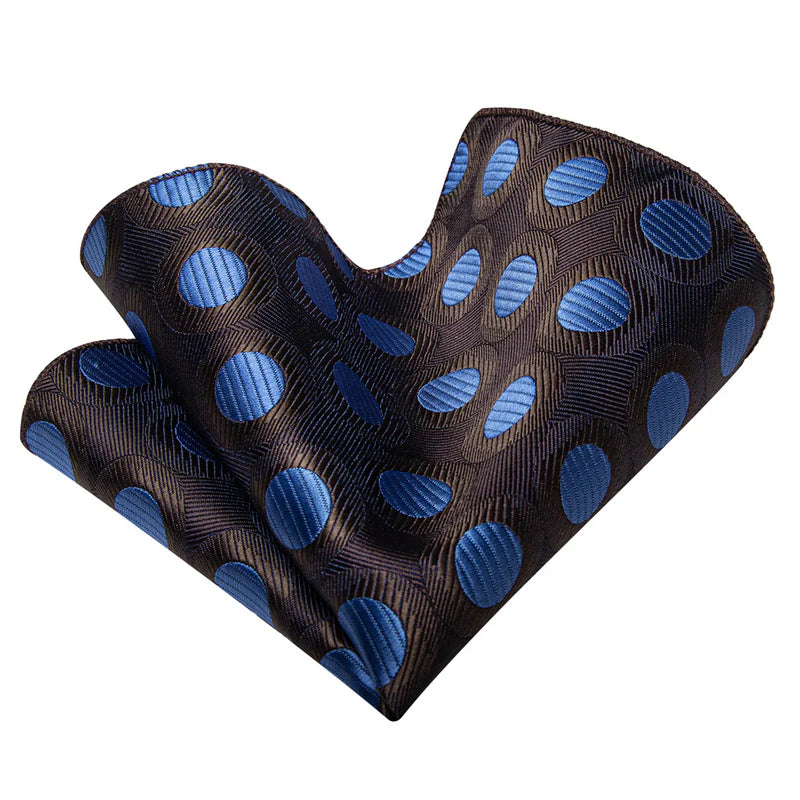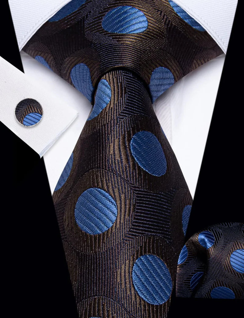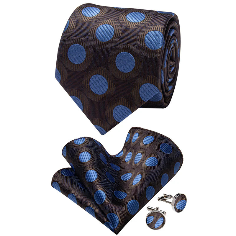 Brown Blue Dots Silk Necktie Pocket Square Cufflinks Set
